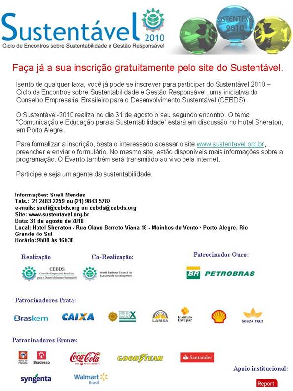 O Conselho Empresarial Brasileiro para o Desenvolvimento Sustentável (Cebds) realiza dia 31 de agosto, das 9h às 17h, no Hotel Sheraton Porto Alegre, o segundo do Ciclo de Encontros Sustentáveis 2010, abordando a “Comunicação e Educação para a Sustentabilidade”. O evento é gratuito, mas as inscrições são limitadas.